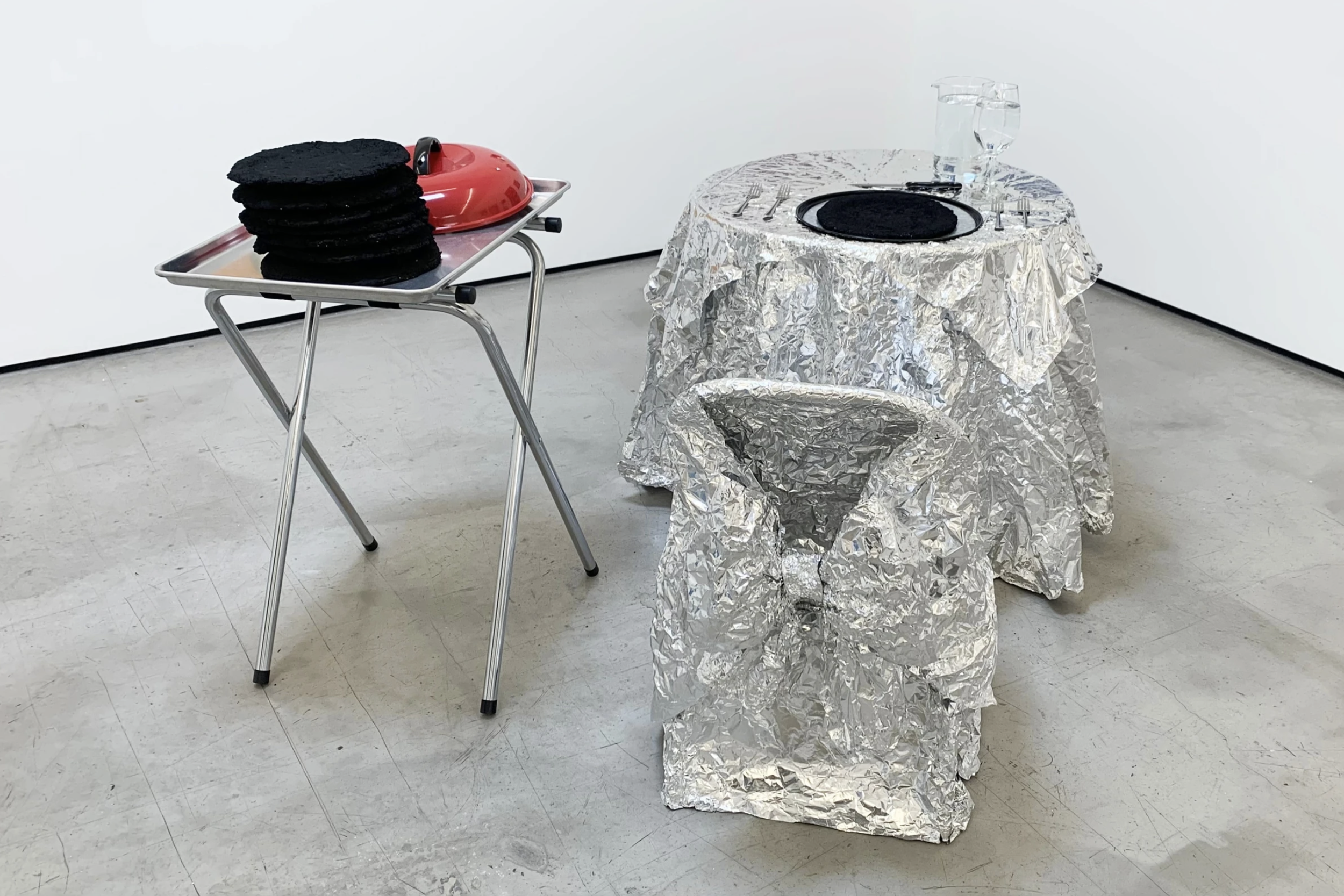 charcoal plates, bbq, welded aluminum foil tablecloth, food tray, aluminum tray, water jug, glass, metal chair, knives, fork